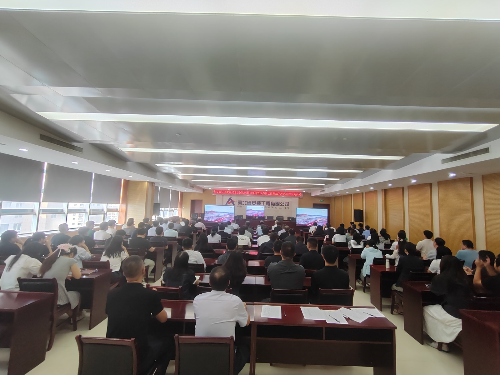 2025年9月3日,為紀(jì)念中國人民抗日戰(zhàn)爭暨世界反法西斯戰(zhàn)爭勝利80周年,河北省安裝工程有限公司積極組織職工集中觀看閱兵盛況直播。公司機(jī)關(guān)及各分公司、項(xiàng)目部共計(jì)2000余人通過多種方式同步參與,共同回顧歷史、緬懷先烈、展望未來。上午9時(shí),習(xí)近平總書記發(fā)表重要講話,9時(shí)19分大閱兵正式開始,公司機(jī)關(guān)及各分公司、項(xiàng)目部會(huì)議室座無虛席,職工們們整齊地坐在屏幕前,神情莊重地注視著電視畫面。在閱兵式過程中,